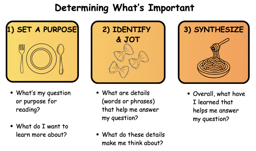 Have you ever made pasta before? (Pause. Students nod their heads.) So to make pasta you have to boil it in water until it’s soft, correct? (Heads nod.) And then you eat the pasta, correct? (Usually, students continue nodding their heads.) Wait! Don’t you have to drain the water first? You don’t want to eat the pasta with the water, right? (Students shake their heads emphatically.) The pasta is what’s important to eat and digest, not the water. It’s the same way when you are reading to determine what’s important. There are pasta words or phrases that we want to eat and digest and then there are water words that are less important.