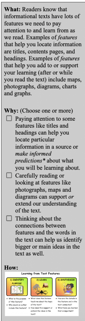 Select a text that has strong supporting/extending features – graphs, maps, photos and captions, etc. Locate 3-4 features that you can focus on during the Phase 2 part of the lesson. If you’re unsure whether the features are strong, think about how you might answer the questions posed in steps 1-3 on the ANCHOR CHART – What is the purpose of the feature? What am I learning from the feature and how does it connect to other ideas in the source? Why is this all important to consider? If you can make a strong case for the power of feature to move your learning forward, then that’s a good choice.