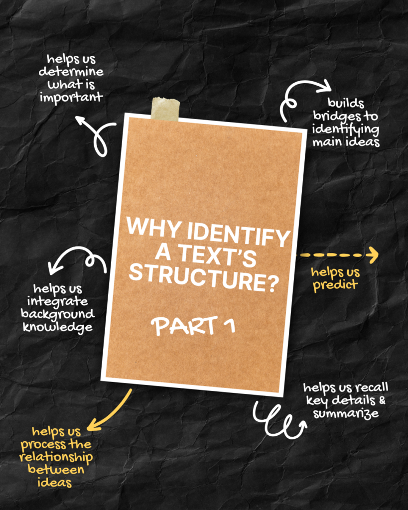- Simple language for introducing the what, why, and how of identifying a text’s structures.